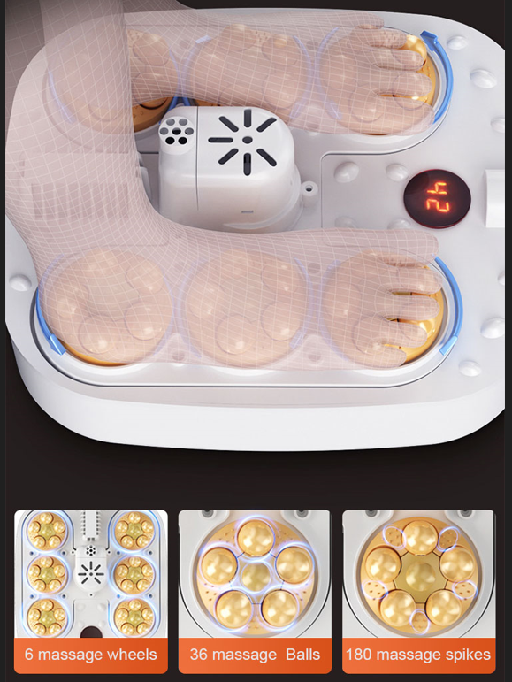 ● ספא רגליים חשמלי 2-ב-1 – יחידה אחת = קערת השריה מחוממת ×1 + מסאז'ר רגליים ×1. מסאז'ר הרגליים הממונע בטכנולוגיית טאיצ’י תלת-ממד כולל 6 כדורי עיסוי מסתובבים עם 3 מצבים (רציף / לסירוגין / חכם) המספקים טיפול לישה עמוק לכפות הרגליים. המסאז'ר ממוקד בנקודות הלחץ להקלה על מתחים לאחר אימון, משמרות ארוכות או יום מתיש.