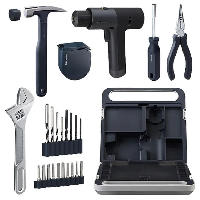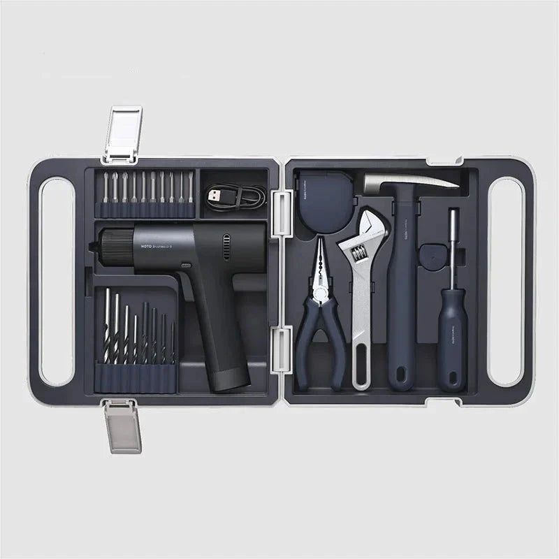 ערכת מקדחה בעיצוב קומפקטי ונייד לאחסון קל. מראה אפור מהמם ו-ABS עם טקסטורה עדינה, המשלבים אסתטיקה ועמידות. המקדחה כוללת מנוע עוצמתי ללא מברשות, בחירת מומנט מותאמת אישית ותצוגת LED בהגדרה גבוהה. הערכה כוללת מברג רב-תכליתי, פטיש עם כפה מגנטית, סרט מדידה עם נעילה עצמית, פלאייר מחט רב-תכליתי, מפתח מתכוונן וסט ביטים מלא—פתרון מושלם לתיקונים ביתיים.